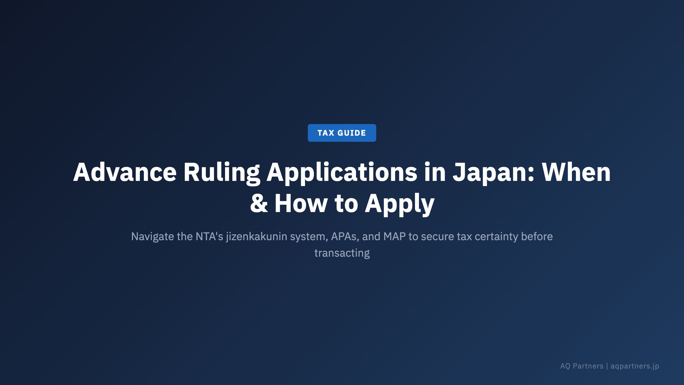 AQ Partners supports foreign companies in Japan with tax compliance, financial reporting, and coordination of advance ruling applications — ensuring alignment between your APA strategy, transfer pricing documentation, and ongoing corporate tax filing obligations. Contact our team to discuss whether an advance ruling application is appropriate for your Japan operations.